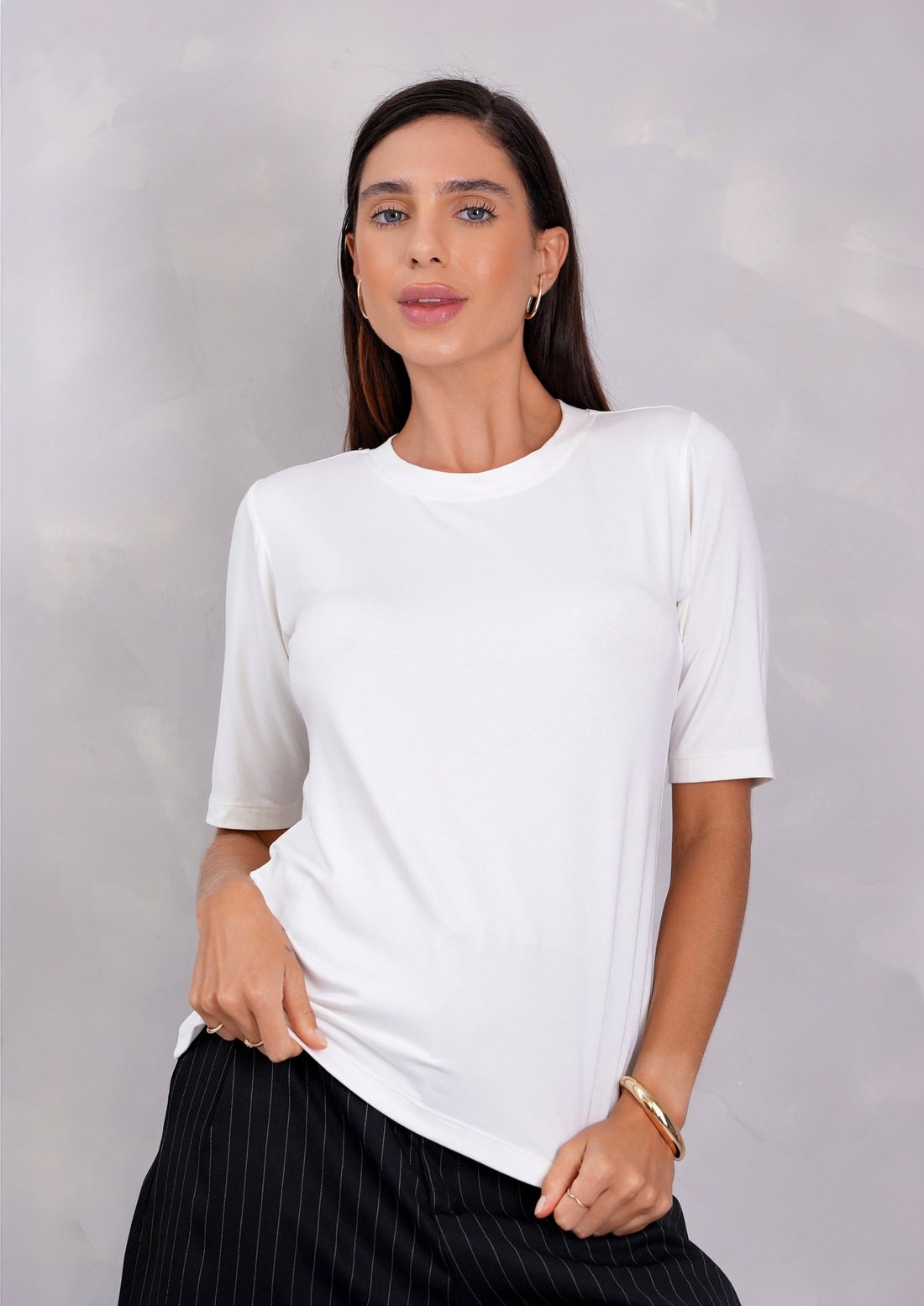 Tecido de malha com toque diferenciado, caimento sedoso, leveza e muita durabilidade. Feito através da tecnologia do fio da Viscose Vortex, que garante a não formação de pilling. Oferece conforto térmico.